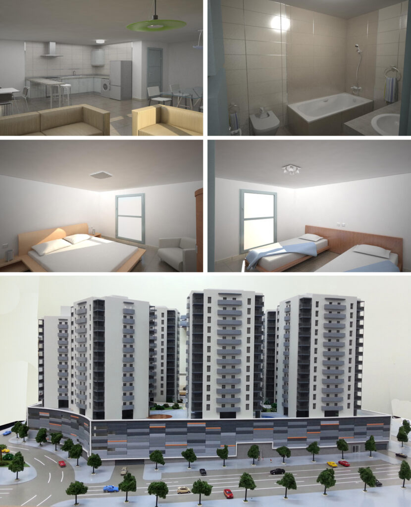 Le complexe, situé dans une zone d’expansion de la ville d’Oran, est un bâtiment hybride avec une grande base commerciale et divisé en sept tours résidentielles en vedette douze plantes .