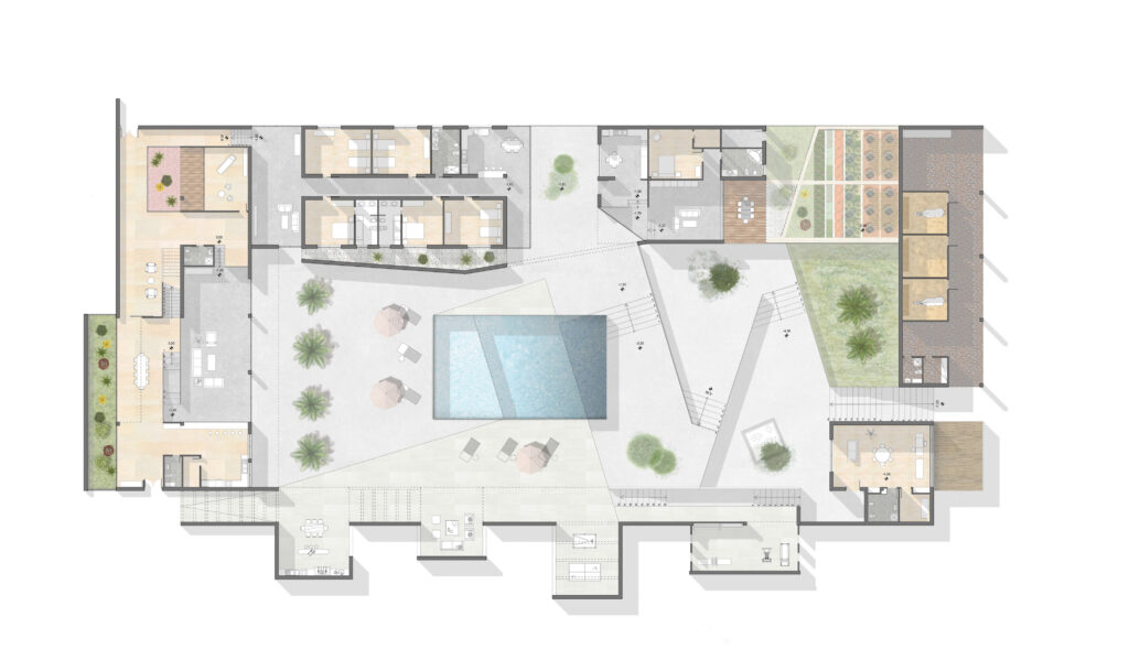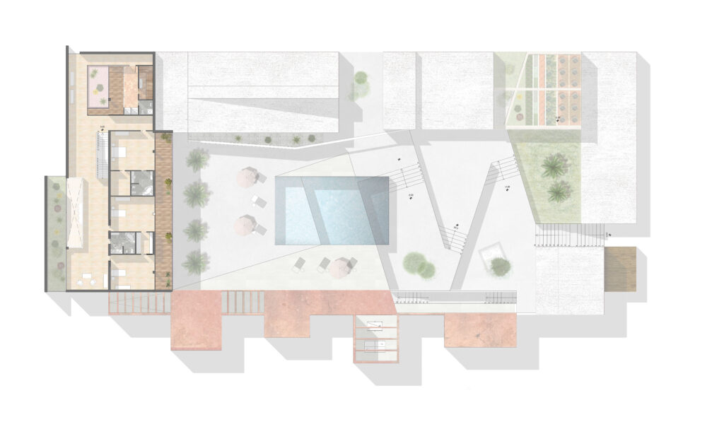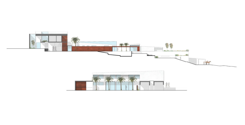 Residencia unifamiliar para una familia numerosa. Lo requerimiento del cliente fueron los de una vivienda que pudiera acoger invitados y donde poder realizarse fiestas y espacios para ocio. estos espacios requerían de un establo para caballos y unos talleres para preparación y almacenamiento de equipo de navegación a vela. La distribucion en planta nos llevo a buscar la vista del mar de cualquier parte de la casa, asi como espacios para huerta y piscina desbordante. Su situación privilegiada en una colina nos llevo a pensar en unos volúmenes opacos y tectónicos los cuales funcio-narían perfectamente integrados en el impacto visual generado en el horizonte.
